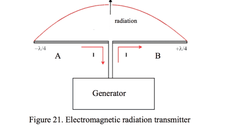 For a 150 MHz (1 MHz=1 million cycles per second) radio signal, the wavelength is 2 m long. If each wire is about 0.5 m long, a half wavelength of radiation will span the two wires taken as one. The result is that electromagnetic waves are generated in the direction of the arrow, moving away from the transmitter at the speed of light.