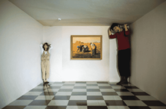 Relevant Equations: This is a so-called "Ames room" and has been constructed to eliminate the usual monocular depth cues that our eyes use to determine distance based on one eye only.