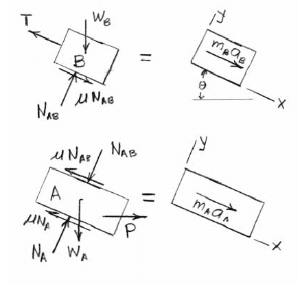 For the problem here, I am given the kinetic friction of the blocks, and I am suppose to find the acceleration of the blocks. I set the x-axis along the incline with x-positive directed towards the right, and I set both the resultant forces of of A and B down the incline since I don't which one goes up or down. Now since A and B will move in opposite directions, how do I know which way to set the frictions?