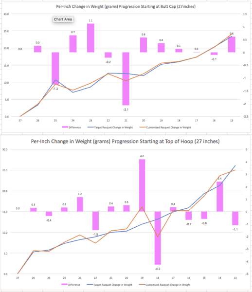 I'd like to determine the weight distribution of the target racquet on an inch-by-inch-segment basis. I'll do the same with the second racquet, adding weight where needed to match the target racquet (the second racquet is far lighter than the target, so this should generally work- and I recognize there may be cases where I would need to remove weight from the second racquet; I'm ok with this problem).