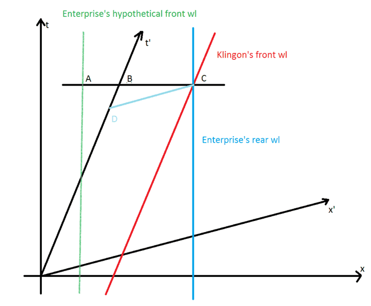 So, for example, if you measure by a ruler the DC segment would be 14.5, you could state for sure the klingon's proper length is 10. So you could use that proper length, and use it for choosing the A point: since the Enterprise and the Klingon's ship share the same length when both at rest, you could use that to choose an A point which x coordinate is 10 units far from C.x ( this means of course forcing the AC segment to be 10 units in length ).