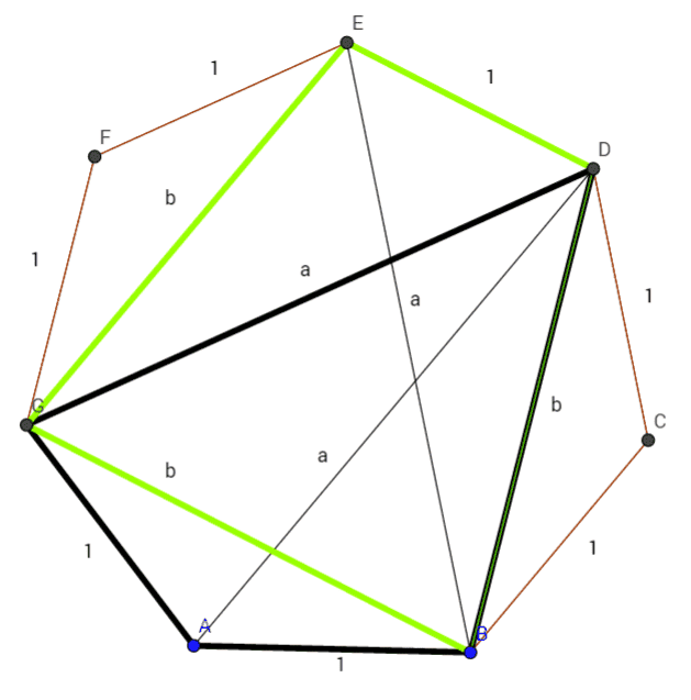 - One participant presents the problem by defining the side lengths of a heptagon as equal to 1 and specifies the diagonals \(\overline{AD}=a\) and \(\overline{BG}=b\) with the condition \(a>b\).