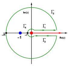 $$\oint_{\Gamma_2} f(z) \, dz +\oint_{\Gamma_4} f(z) \, dz+ \int_{\Gamma_3} f(z) \, dz + \int_{\Gamma_1} f(z) \, dz = 2\pi i \text{Res}(f(z) ; -1) $$