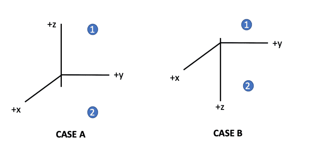 In case A, I have defined my axes to be as shown in the picture, with +z pointing up (x and y really don’t matter in my example). Suppose gravity points down (so it is in the direction of negative z) and that there is a particle (a blue ball) somewhere in the 3D plane.
