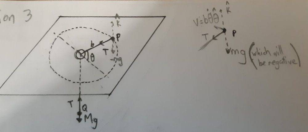 A particle P of mass m slides on a smooth horizontal table. P is connected to a second particle Q of mass M by a light inextensible string which passes through a small hole O in the table, so that Q hangs below the table while P moves on top. Investigate motions of this system in which Q remains at rest vertically below, while P describes a circle with center O and radius b. Show that P moves with constant speed u, $$u^2 = (Mgb)/m$$