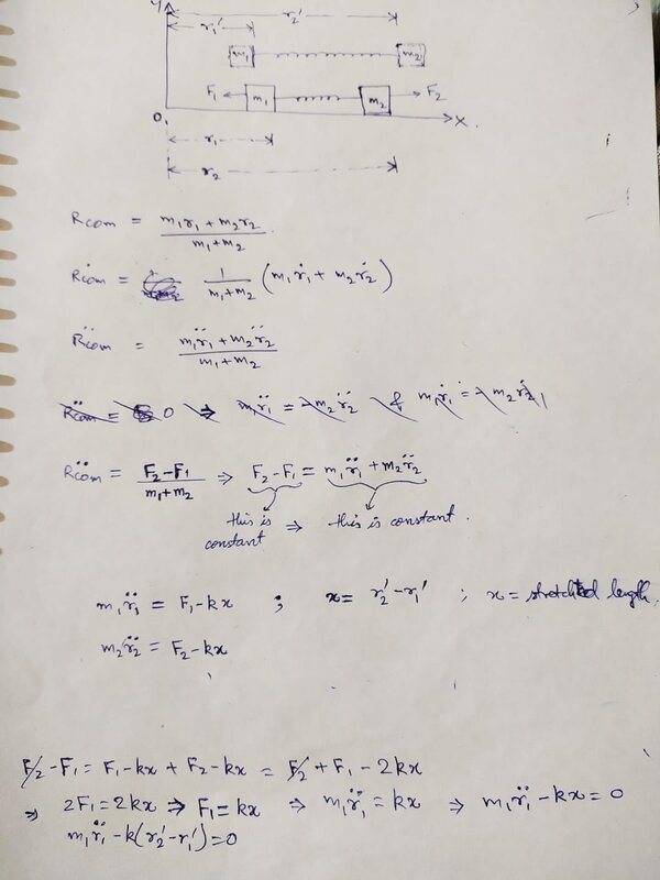 - Participants discuss various methods to approach the problem, including energy conservation in different frames, the application of Newton's second law, and the implications of forces acting on the masses. Questions arise about the nature of motion (simple harmonic vs. static) based on how forces are applied.