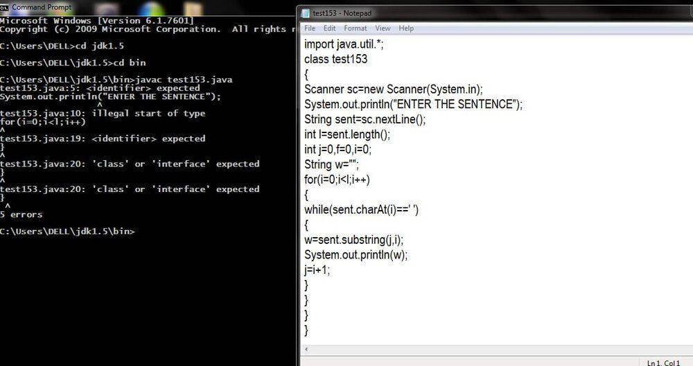 - I want to write a program in java that takes a sentence as an input and displays each word separately in a new line .I came up with this .But the compiler is displaying an error and i can't make out where i made a mistake.
