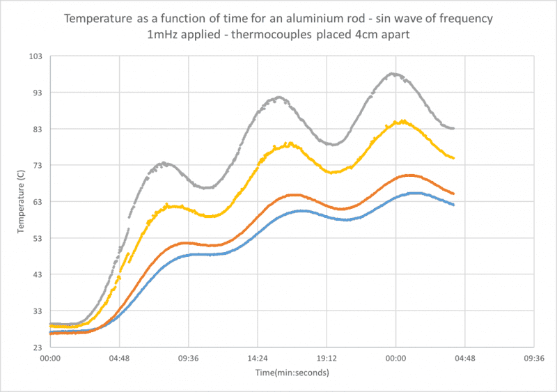 The experiment involved heating a long thin bar from one end with a sinusoidal heat wave. Thermocouples were then placed every 7 cm (4 in total) and temperatures were recorded. The experiment brief sheet stressed that we work out thermal diffusivity from this and then thermal conductivity from that.