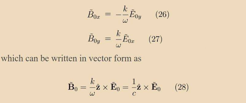 This discussion focuses on deriving the relationship between the electric field vector, vec{E}, and the magnetic field vector, vec{B}, in the context of electromagnetic waves using Maxwell's equations. The plane-wave solutions are expressed in the form vec{E} = vec{E}_0 exp(-i ω t + i vec{k} · vec{x}), where ω(vec{k}) = c|vec{k}|. The relationship vec{B} = (c/ω) (vec{k} × vec{E}_0) exp(...) is established, confirming that vec{E}_0, vec{B}_0, and vec{k} form a right-handed orthogonal set of vectors, with magnitudes |vec{E}_0| = |vec{B}_0|.