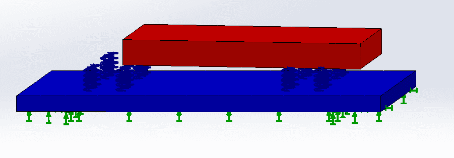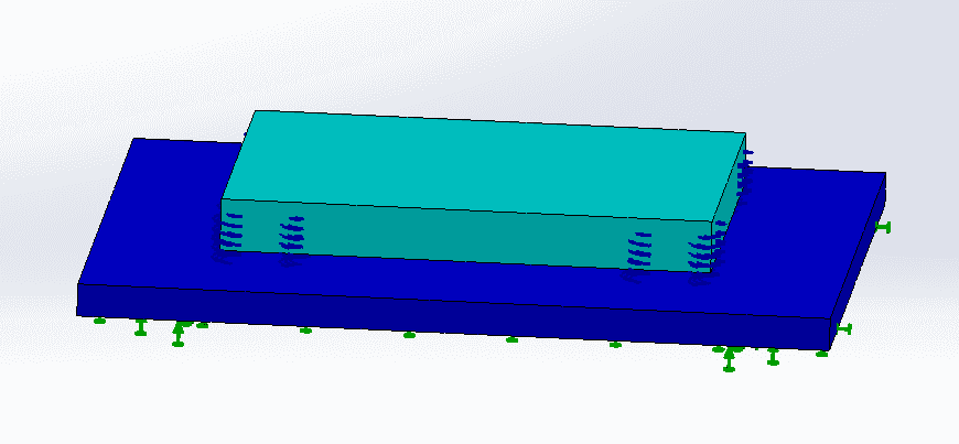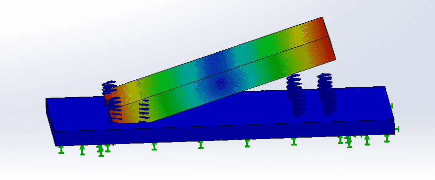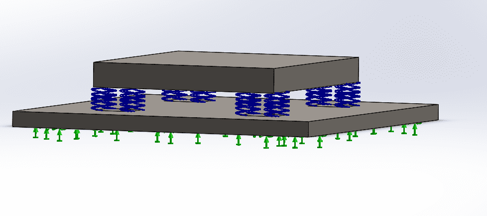Mass : 19 KG , identical springs with coefficient: 12 kN/m tension/compression (48 kN/m for the 4 springs) and 3.9 kN/m in shear (15.6 kN/m for the 4 springs), damping ratio: 0.2 , box size: 300x250x300 mm (the height is 300 mm, but it is incorrectly simulated as less, but that won't affect the frequencies of the whole box).