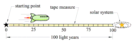 . But if you had a tape measure between you and the solar system, the distance would still read 100 light years.