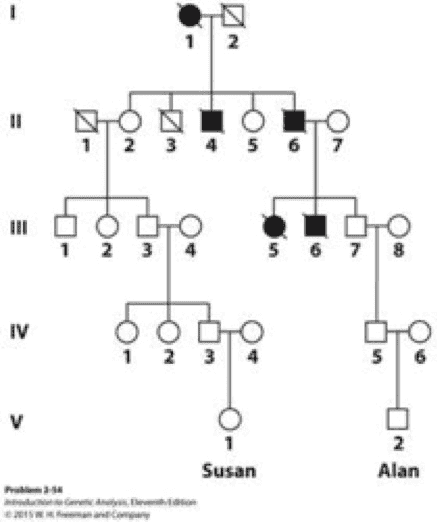 b) Form an opinion on the likliehood that Susan and Alan will develop Huntington disease. Assume for the sake of the discussion that praents have children at age 25.