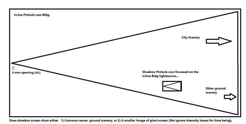 - The Irvine Giant Pinhole Box generated a ~40m landscape image w. a 4mm hole. Q. is on effects of directing another small pinhole box at the lightsource, while standing in lower part of scenery.