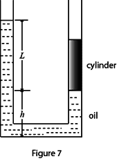 a U-tube with cross-sectional area A and partially filled with oil of density S. A solid cylinder, which fits the tube tightly but can slide without friction, is placed in the right arm. The system is in equilibrium. Find the weight of the cylinder in terms of g, h, A, L, and S.
