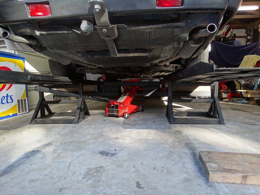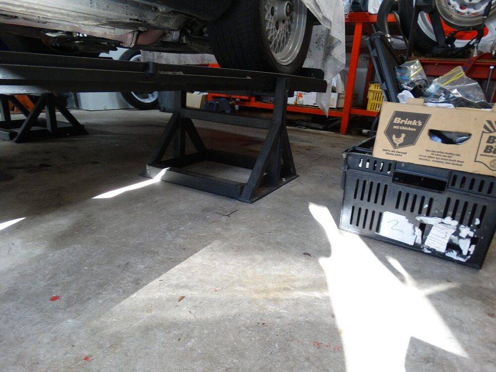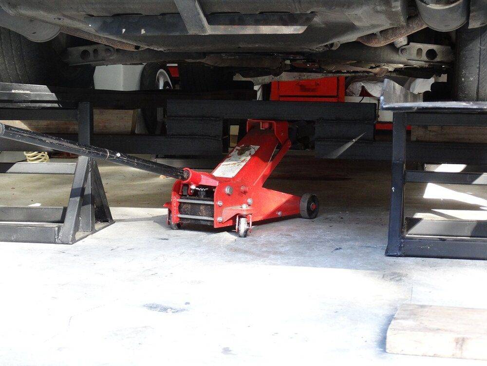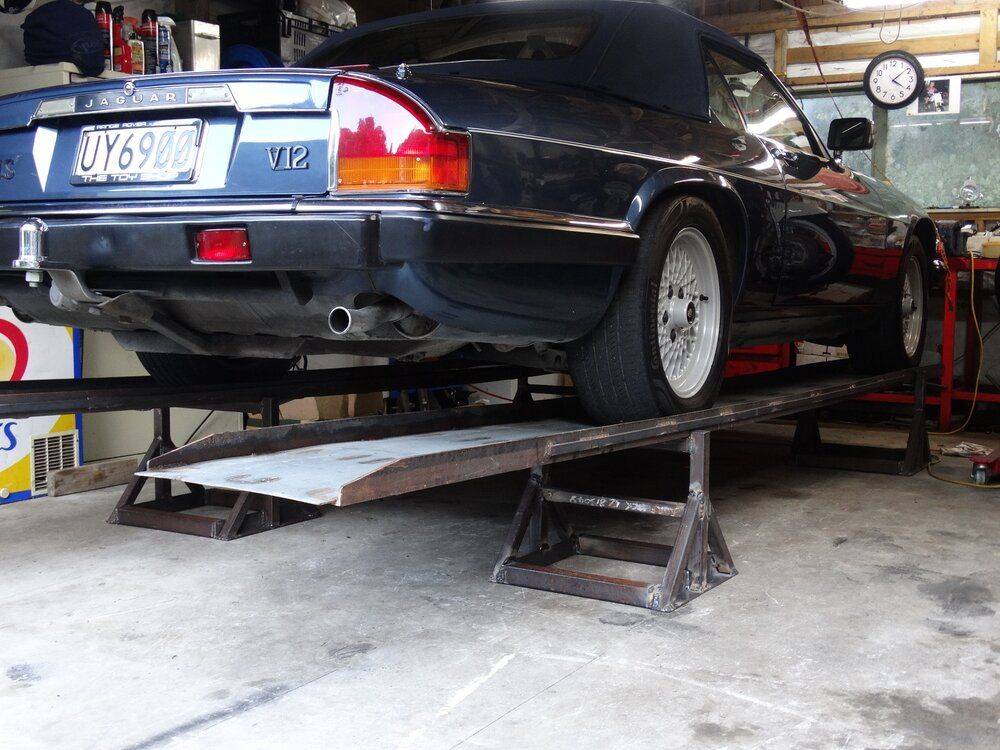I currently jack up the end of the ramps using the channel frame and a 3 1/2 ton jack, because of the height of the channel frame I have to have it sitting quite far back under the car for clearance when the ramp is lowered down to drive off.