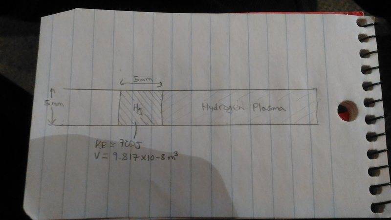 A 5mm diameter, 5mm length liquid mercury projectile is to be fired down a barrel. The projectile is fired at 0.00002 mols of hydrogen plasma at 300000 Kelvin. The piston should ideally compress the plasma to the point at which fusion will occur.