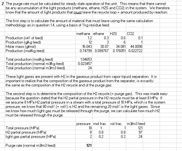 1.2) Some gaseous products are produced during residue hydroconversion that cannot completely be removed as either liquid phase products, or through scrubbing, i.e. they end up in the H2recycle. For the process considered, these products are methane 1.2 wt%, ethane 0.3 wt%, H2S0.6 wt%, and CO2 0.1 wt% (wt% of the residue feed). If the H2 partial pressure in the H2 recyclemust be at least 8 MPa, what is the purge rate in normal m3/m3 residue feed? (Hint: Non-H2gases in the recycle must be purged at the rate of their formation).