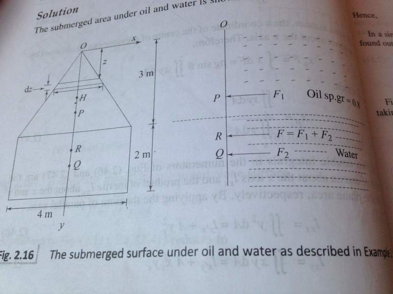 The triangular part is submerged in oil of specific gravity 0.8, while the rectangular part is submerged in water. The whole structure is upright with no inclination with fluid surface.
