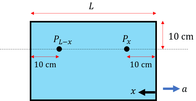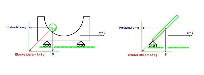 Right. So if you have a column of water ##\frac{h}{\sqrt{2}} \text{meters}## in diagonal extent so that our test point is ##\frac{h}{\sqrt{2}}\text{ meters}## below a reference point at the surface in a direction 45 degrees up and to the right. It will be at a pressure delta of ##\sqrt{2} \rho g h\frac{1}{\sqrt{2}}## above surface pressure.Lnewqban said:That point is supporting the force (each mass x common diagonal acceleration) of all the molecules that are aligned with the resultant acceleration vector and located between that point and the surface.