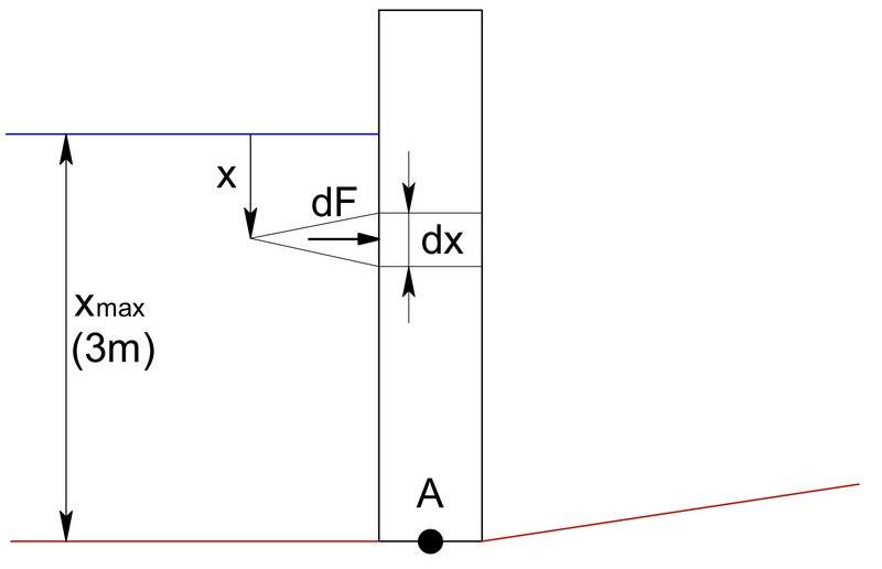 Participants express uncertainty about the integration limits and the correct formulation of the moment around point A. The discussion highlights the dependence on the definitions of pressure distribution and the geometry of the wall.