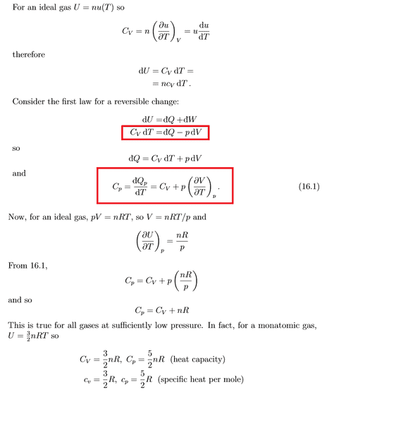 So, using our new definitions, we find for an ideal gas that $$C_pdT=C_vdT+dPV)=C_vdT+RdT$$So it follows immediately that $$C_p=C_v+R$$