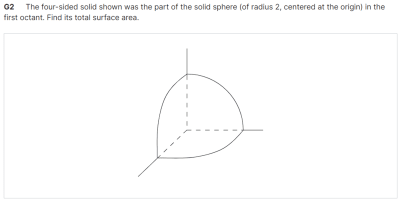 That's just the surface area of the part of the sphere. The problem is asking for the area of the partial sphere surface, plus the three other sides.samy4408 said:So it is 2*pi