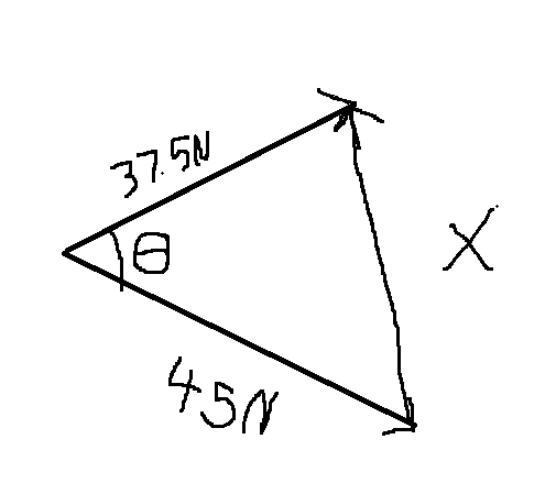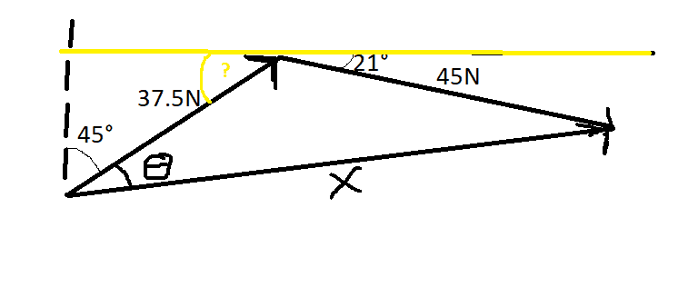 The discussion revolves around finding the resultant of two vectors: 37.5N directed northeast and 45N at an angle of 21° south of east. The original poster expresses difficulty in determining the angles necessary for calculating the resultant.