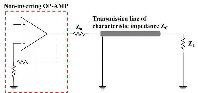 This is the circuit what I made in which ZO and ZL are output and load impedances, respectively. The commercial voltage probe with oscilloscope is used to measure VL, voltage over ZL . VO, the voltage difference measured between output of the OP-AMP and ground by the probe is square signal of positive 13 V with ~ 10 μs pulse duration. Characteristic impedance of the transmission line ZC is 50 Ω.