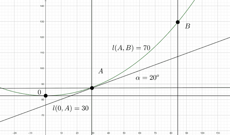 $$s_A=\displaystyle\int_0^{x_A}\,\sqrt{1+[y'(x)]^2}\,dx=y_0\,sinh{\cfrac{x_A}{y_0}}\Longleftrightarrow{30=y_0\,sinh{\cfrac{x_A}{y_0}}}=y_0\cdot{y'(x_A)}=y_0\,\tan{20^o}\Longrightarrow{y_0=\cfrac{30}{\tan{20^o}}}$$