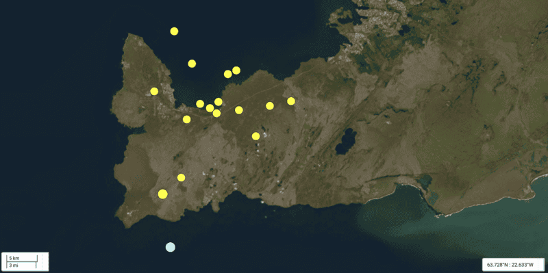 Since the morning of November 11th, seismic activity related to the magma intrusion remains fairly constant. Since midnight November12th, around 1000 earthquakes have been recorded within the dyke, and all of them have been below M3.0 in magnitude. The most seismic activity has been located in the region north of Grindavík. Most of the earthquakes are at a depth of 3-5km corresponding to the lower part of the dyke intrusion.