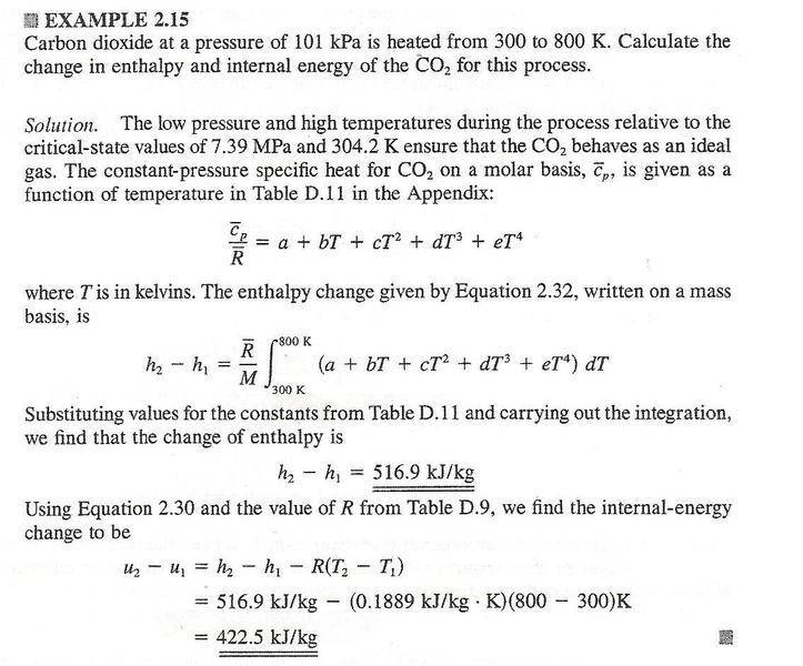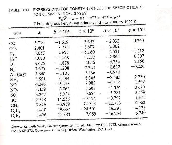 Then in the next line of formula in the solution (h2-h1 = R/M integral (a+bT...)dT) how did it go from Cp/R to R/M? I'm totally lost in this. And by the formula do I seriously plug in these huge numbers (from D11)? I tried plugging it in and get keep getting somethign to the 17th power. I'm also very confused on the units, as there's a lot of variables and I'm not very clear on them and what they represent. Any help would be appreciated. Thanks!