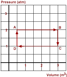 An ideal monatomic gas is confined to a cylindrical container having a movable, yet "snuggly-fitting," lid that slides up and down to accommodate changes in pressure and volume. The diagram shown below, outlines the steps in a heat cycle starting at position A and moving through positions B, C, D and then back to A.