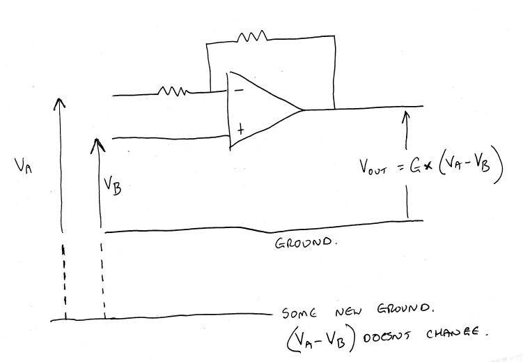 - Participants discuss the concept of common mode rejection and how it relates to the output voltage when both inputs are referenced to the same ground.
