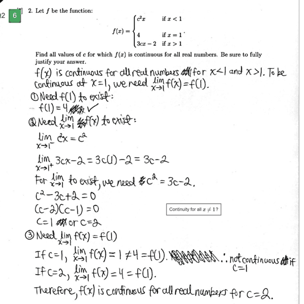 I recently wrote a test for an introductory calculus class and was confused by the grading of one of the questions regarding continuity. I have attached a screenshot of the test question and my work below. There was a comment reading "Continuity for all x ≠ 1?" and I was deducted marks as a result. I am wondering if anyone could shed some light on where and what the error that I made was, because I am having difficulty identifying it. Thank you! All help is much appreciated.