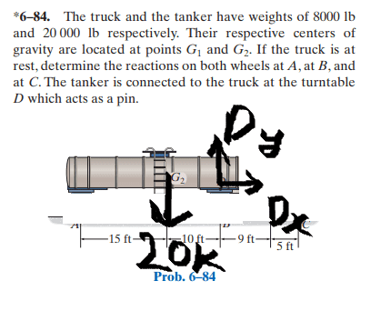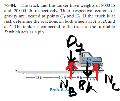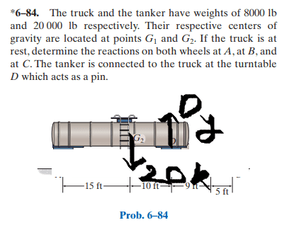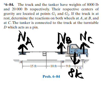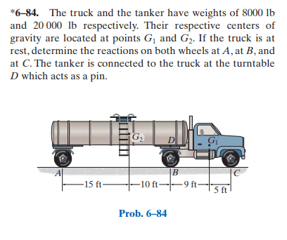 3) With question 1 answered, I'm still uncertain as to which joint I'm dealing with in exercise 6.84 (the truck) and how do I even draw a Free-body Diagram of the massive truck? I tried treating the wheels as rollers and did not succeed for not having enough equilibrium equations.