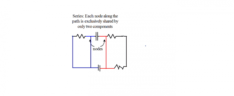 The discussion focuses on identifying series and parallel connections in electrical circuits, specifically regarding capacitors. It establishes that capacitors connected between the same two points are in parallel, while those sharing a single node exclusively are in series. The conversation emphasizes the importance of understanding circuit topology and provides visual aids, such as color-coding nodes, to differentiate between connections. The participants clarify that a node is a conductive path where two or more components connect, and only two components can be in series at any given node.