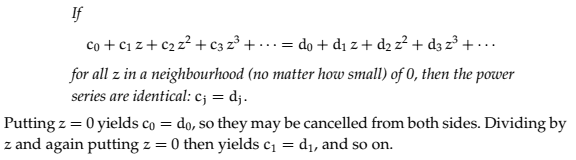 - A later reply introduces a simpler proposition that reinforces the idea that if a power series equals zero in a neighborhood of zero, all coefficients must be zero.