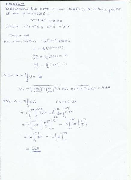 The problem involves determining the area of a surface defined by a portion of a paraboloid, specifically where the equation \( \frac{x^2}{2} + \frac{y^2}{2} - 2z = 0 \) holds under certain constraints in the x-y plane.