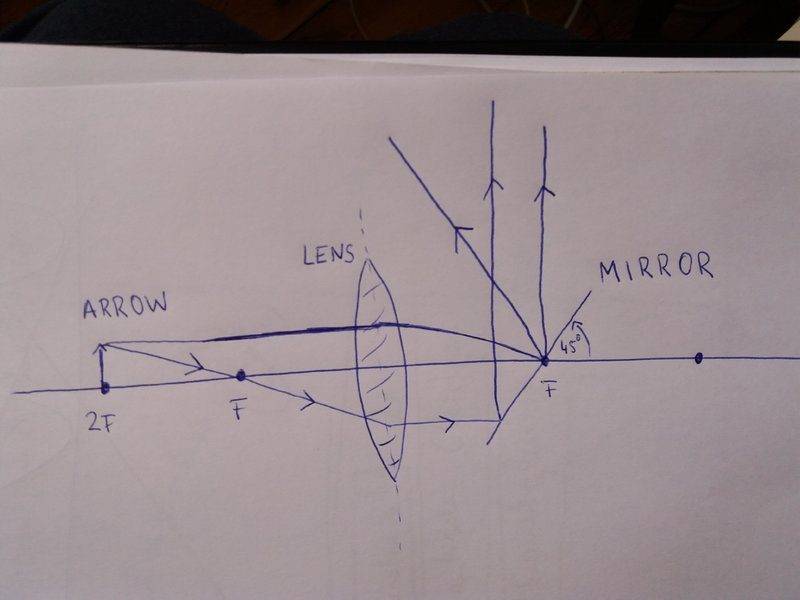 suppose we are given a biconvex lens with focal length of 4 cm. Further, an arrow of height 1 cm is placed in front of the lens in a distance of 8 cm (i.e. twice the focal length). Lastly, a mirror is placed on the other side of the lens at a distance of 4 cm and such that it performs an angle of 45 degrees with the optical axis and such that no reflected ray will hit the lens again. I want to know where the image of the arrow will occur.
