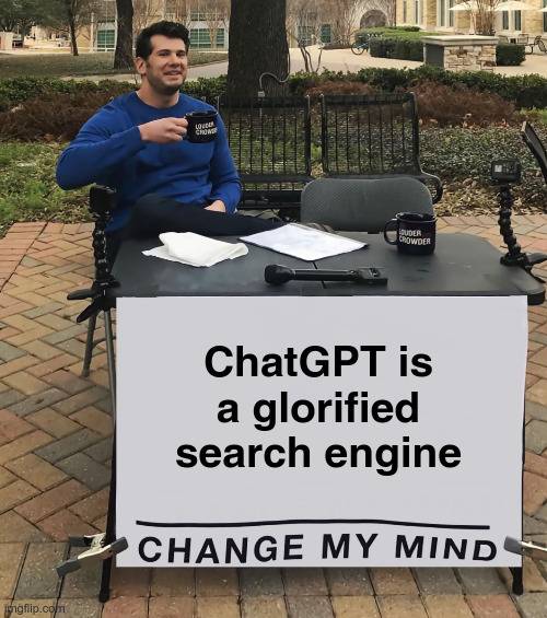 ChatGPT certainly does not work like modern search engines such as Google. They (Google and Bing) are moving closer to a hybrid model known as Retrieval Augmented Generation (RAG) though.jack action said:I still stand by my meme: