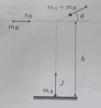 - A body, of mass ## m_A = 2kg##, is initially at rest on the ground. ##A## is then subjected to a vertical instantaneous impulse of magnitude ##J = 10 Ns##. When ##A## has a velocity of ##v_A = 5m/s##, the body is struck in a perfectly inelastic collision by the body B. Knowing that ##m_B=0.2Kg## and that ##B## has a constant horizontal velocity, ##v_B= 5m/s##, determine: