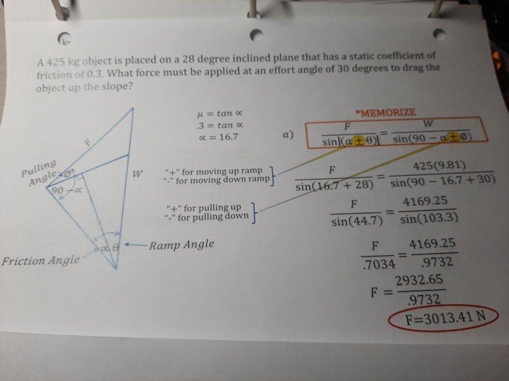 Hi Smart People, I have spent a lot of time on this and have looked in Reed's and Wallker's applied mechanics but can't find a clear explanation. Calculating the force required when pulling up an inclined plane whether horizontally to the plane or at an angle seems pretty straight forward. But, if dragging the object down the plane how would the answer change...not sure what to do with the friction angle. Does the formula shown work in this case...also, not sure if the "absolute" sign is required. Thanks a bunch everyone.