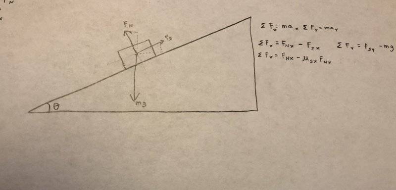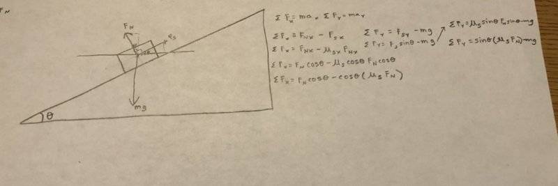 The static friction coefficient on an inclined plane is equal to tan(θ). The problem requires me to prove this also works by using an x-axis parallel to the ground rather than parallel to the incline. I understand how to get tan(θ) using the incline as the x-axis, but I don't know how to get tan(θ) using an x-axis parallel to the ground.