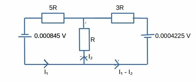 Kirchhoff’s 2nd law, left loop: 0.000845 + 0.065I₂ + 5*0.065I₁ = 0