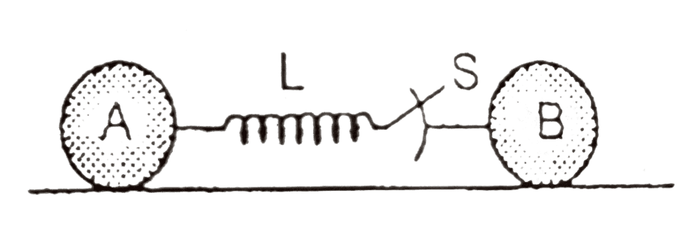- Two fixed identical metallic spheres A and B of radius R=50cm each are placed on a non-conducting plane at a very large distance from each other and they are connected by a coil of inductance L=9mH as shown in figure. One of the spheres (say A) is imparted an initial charge and the other is kept uncharged. The switch S is closed at t=0. After what minimum time t does the charge on the first sphere decrease to half of its initial value ?