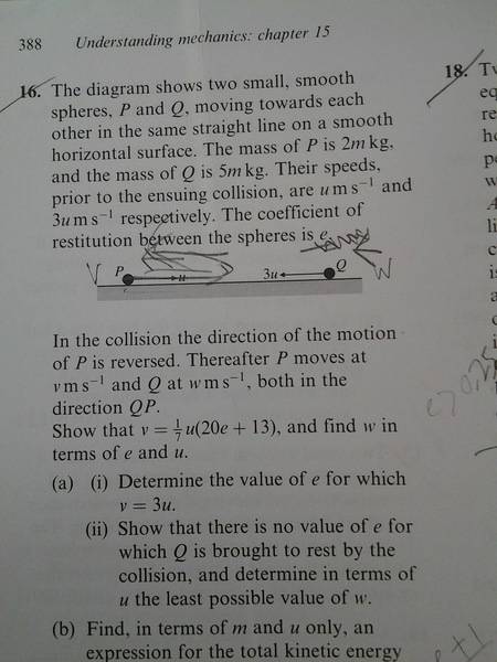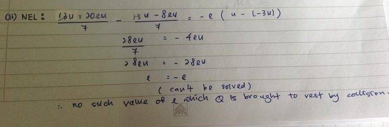 V1- V2 = -e(U1-U2) ,even when V2 is faster than V1. Because he said in his brain, 2 always comes after 1, so he doesn't want to use V2-V1. I don't follow him, I follow the book, using speed of separation = fast - slow. But I still don't understand why he used V-W = -e(4u) to assume Q is brought to rest. (or did he even make that assumption at all?)