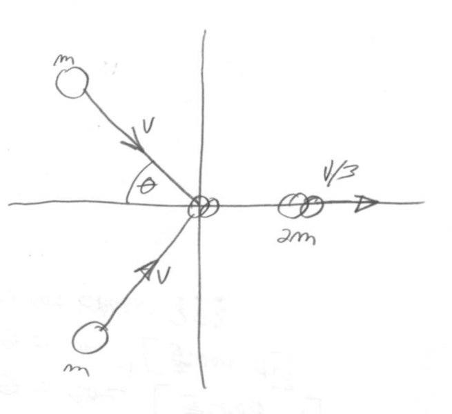 The problem involves an inelastic collision between two objects of equal mass, each initially moving with speed v. After the collision, they move together at a speed of v/3, and the task is to determine the angle between their initial directions. The discussion centers around the conservation of momentum in both x and y directions.