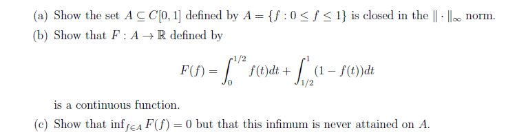I have already done part a and b. Part a is easy, for part b, i let the anti-derivative of f to be k(t)+c and arrive at the answer that F(f)= 1/2+ 2*k(1/2) - k(1). But i don't know how to do the next part, can anyone give me a hint? the question c ask me to show that the infimum of F is 0 and it is never attained on A.