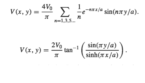 V(x,y)=\frac{2V_0}{\pi}\left [\frac{\pi}{2}-\arctan(\frac{\sinh(\frac{\pi}{a}x)}{\sin(\frac{\pi}{a}y)})\right ]