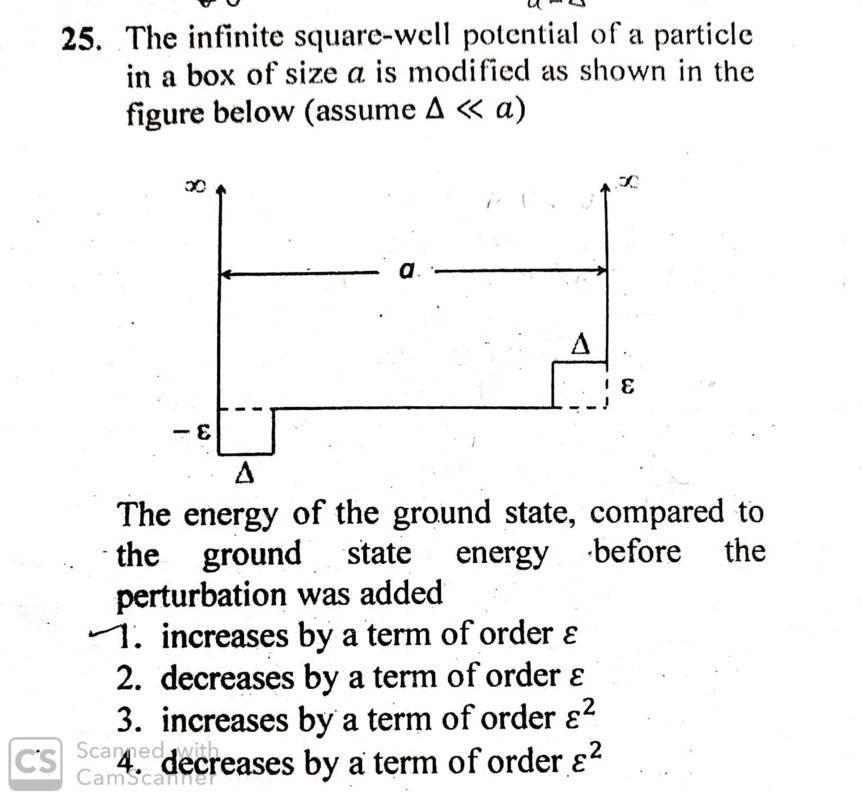 - In an infinite potential well, two small constant perturbations \epsilon are added in the two opposite corners of the well in an infinitesimal extent (\delta). In what order of \epsilon the correction to the ground state energy would be? See the attached file.